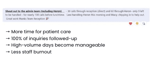 Staff reported fewer disruptions, clearer follow-ups, and high-volume mornings that no longer felt overwhelming (even on days with close to 100 calls before lunchtime).