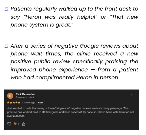 This case study shows what happened when the clinic introduced Heron as a support layer for its front desk — not to replace people, but to give them room to breathe.