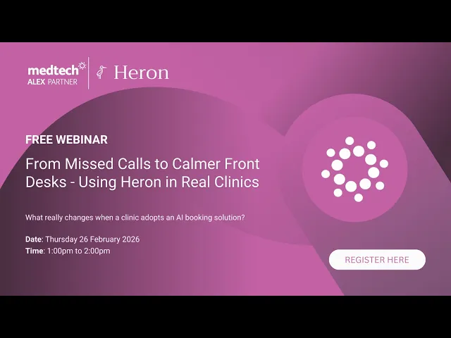Patient inquiry management is one of the most persistent pressure points in medical practices. In this webinar, Heron founder Rohan Adarkar walks through exactly how the platform works inside a real clinic, live demo included, with a full Medtech Evolution PMS integration using the Medtech ALEX® API.